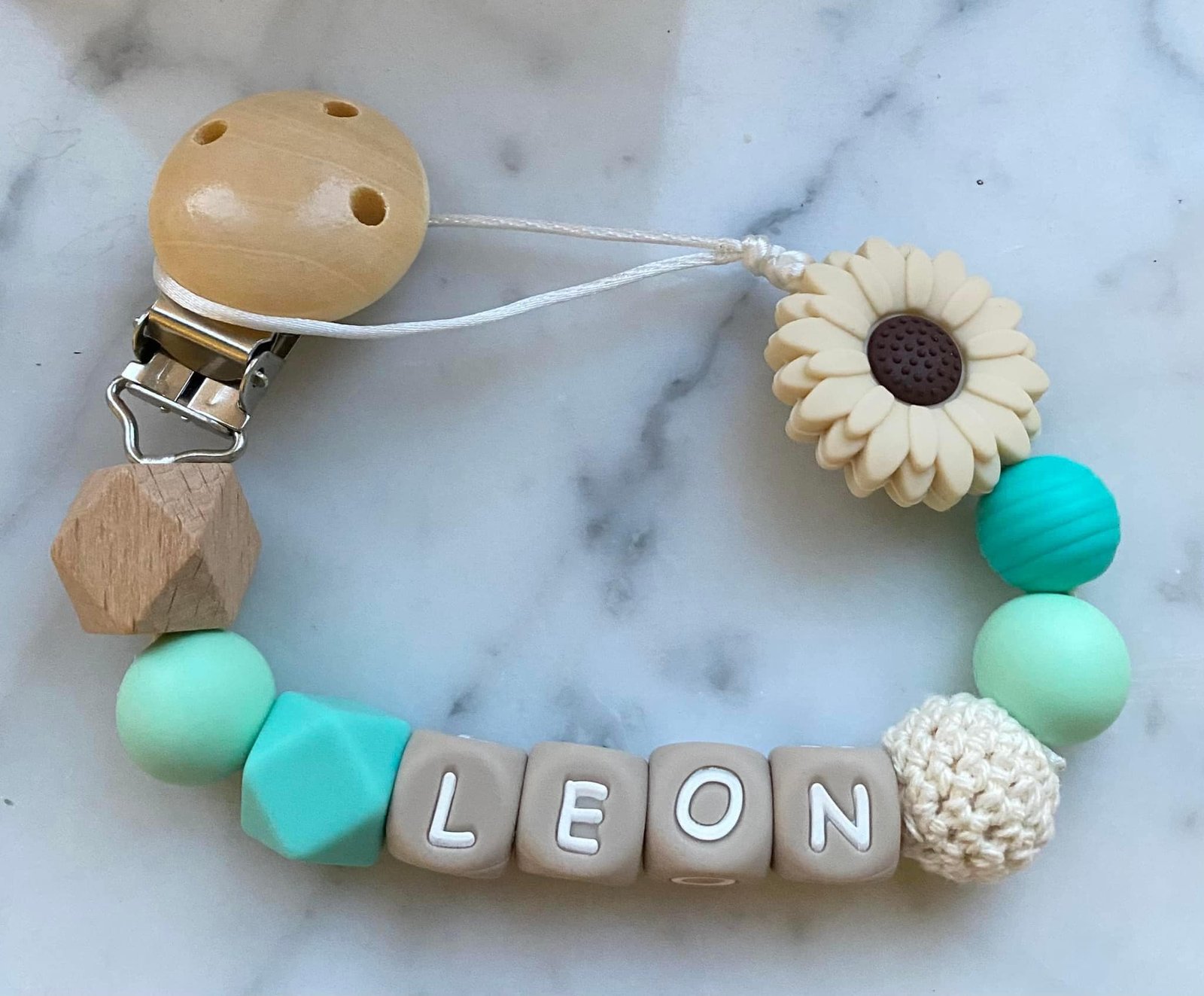 Attache tétine personnalisée avec le prénom de votre choix. Fabriquée à la main en Belgique avec des perles en silicone alimentaire, sans BPA.