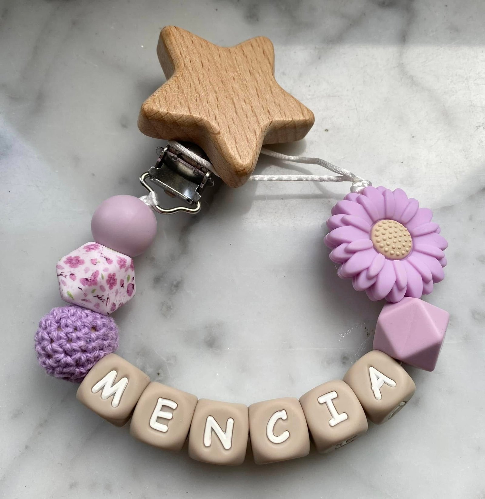 Attache tétine personnalisée avec le prénom de votre choix. Fabriquée à la main en Belgique avec des perles en silicone alimentaire, sans BPA.