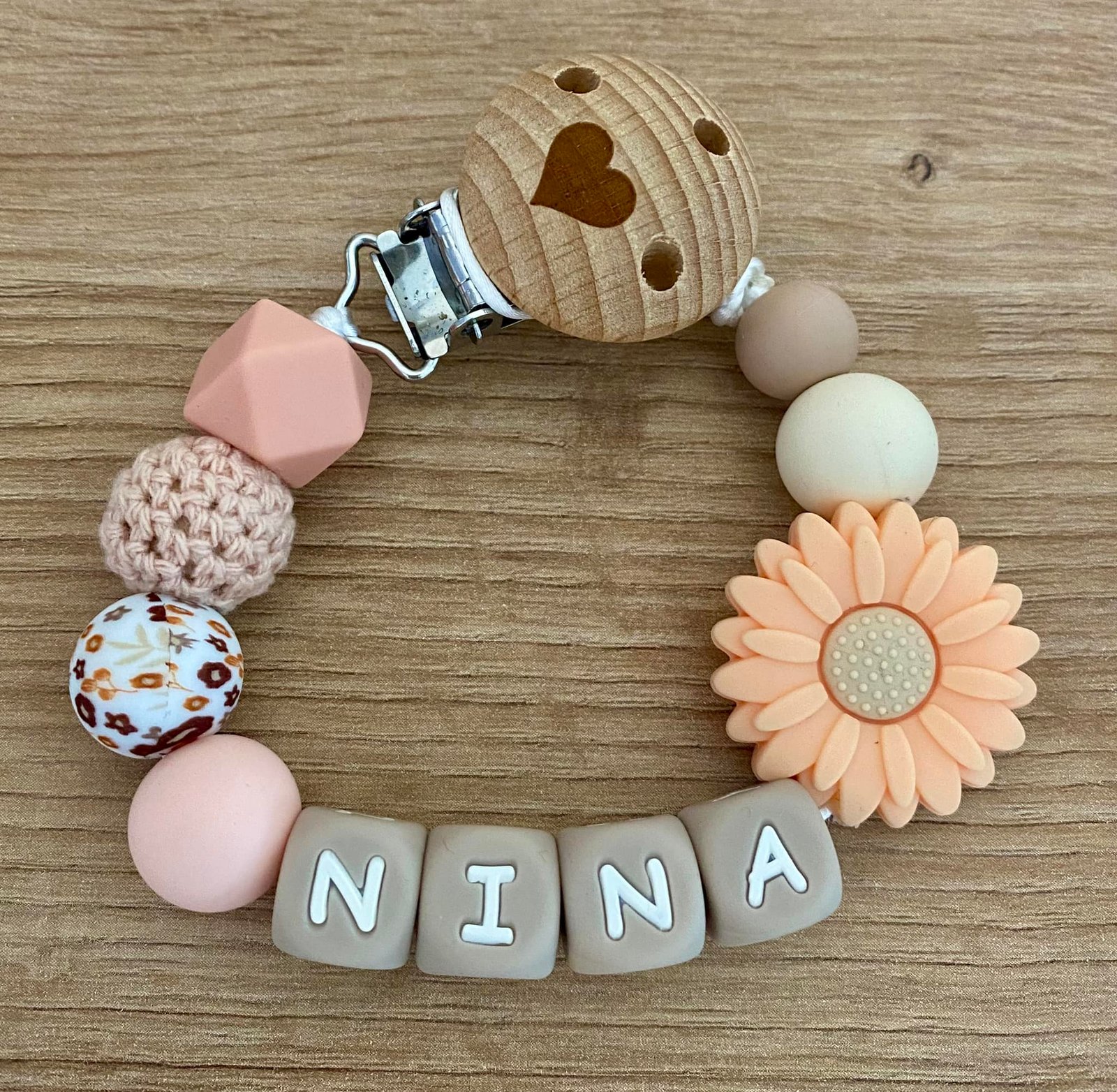 Attache tétine personnalisée avec le prénom de votre choix. Fabriquée à la main en Belgique avec des perles en silicone alimentaire, sans BPA.