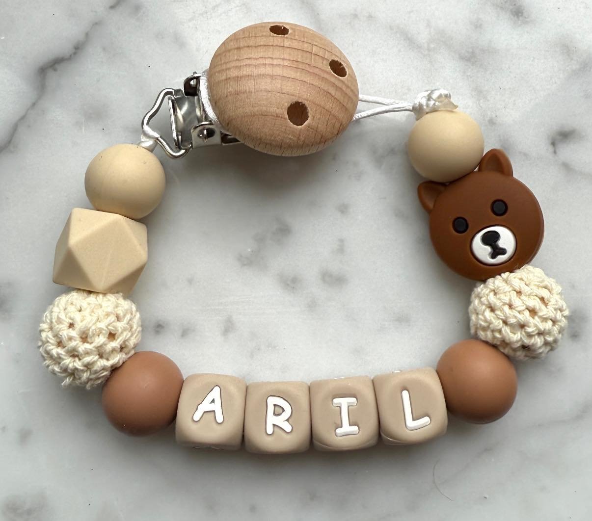 Attache tétine personnalisée avec le prénom de votre choix. Fabriquée à la main en Belgique avec des perles en silicone alimentaire, sans BPA.