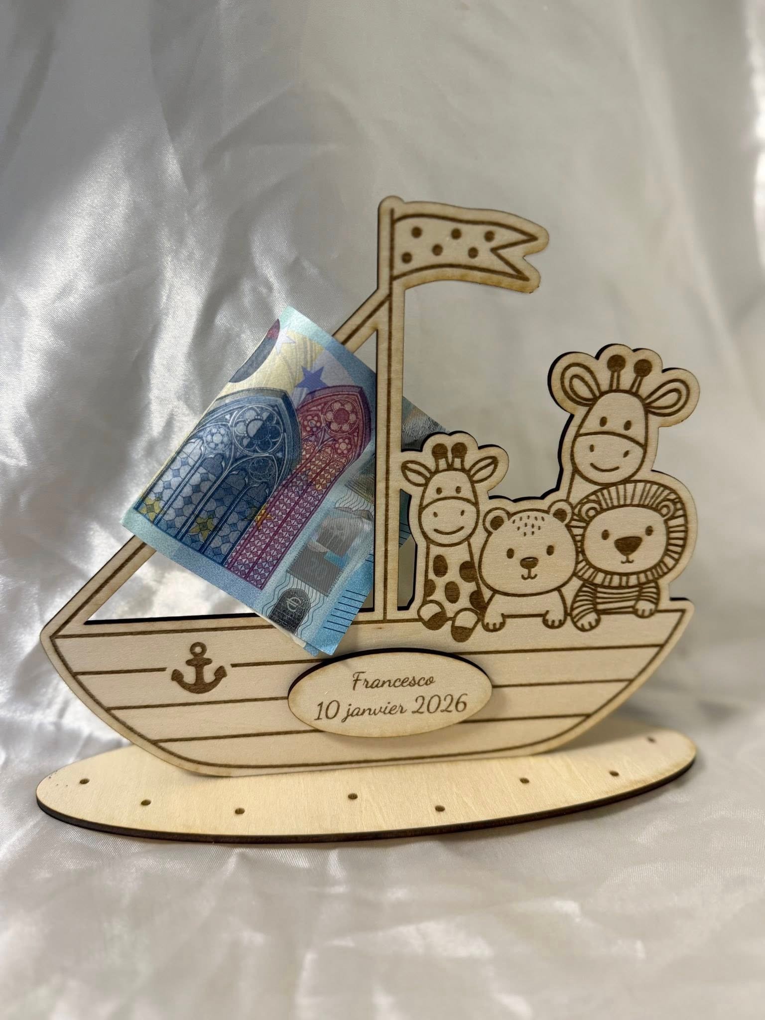 Ce bateau enveloppe est une création originale pour offrir un cadeau de baptême de manière élégante et unique. Personnalisé avec le prénom de l’enfant.