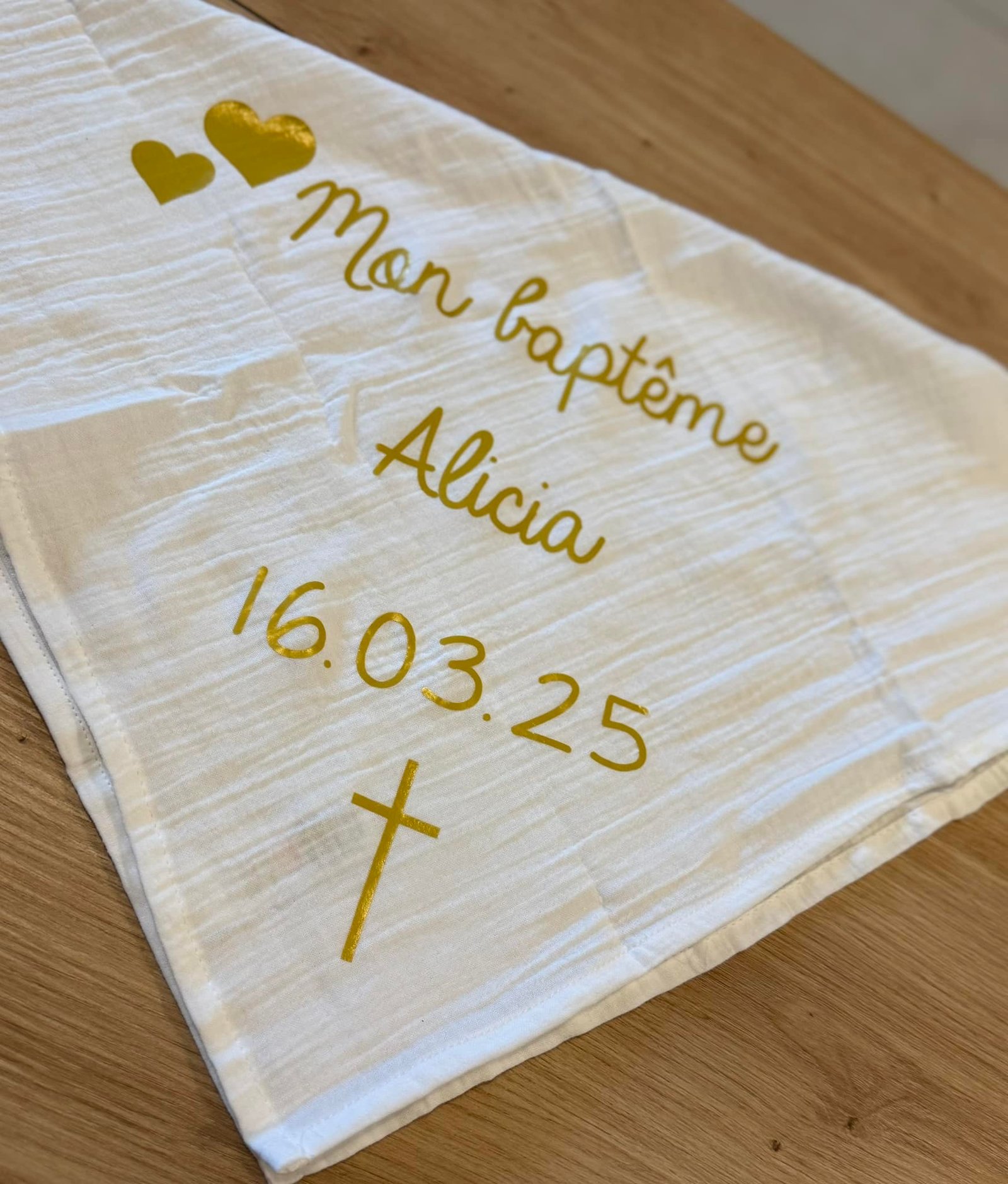 Ce châle de baptême est une pièce unique, brodée à la main avec le prénom de l’enfant et la date de la cérémonie. Un souvenir précieux qui traversera les années.